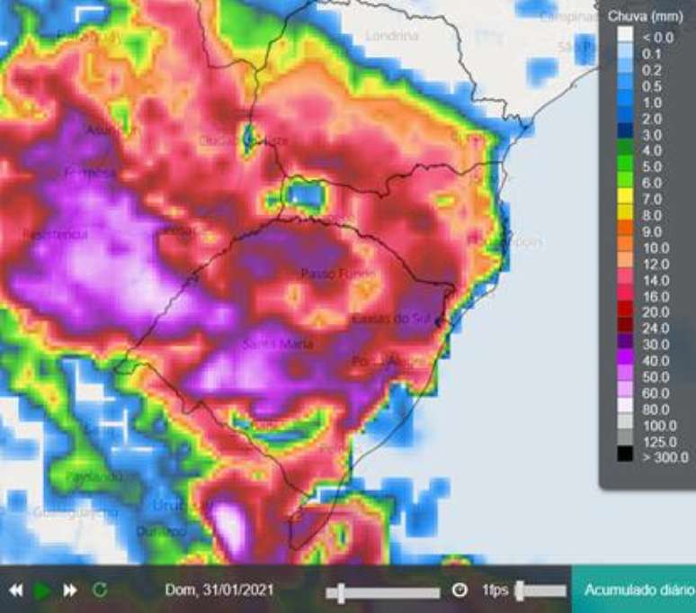 Já no domingo, a chuva é mais volumosa e intensa com acumulados significativos especialmente no Rio Grande do Sul, onde o total de chuva se aproxima de 100mm em algumas áreas gaúchas, como indicado abaixo: