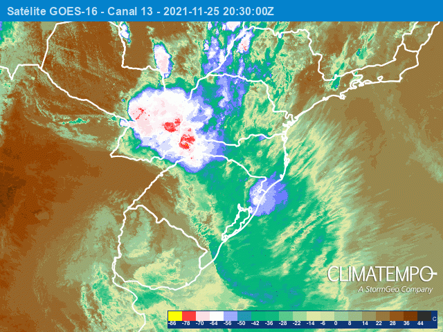Nuvens carregadas (em vermelho) provocaram rajadas de vento entre 80 e 115 km/h no Sul do Brasil em 25/11/2021