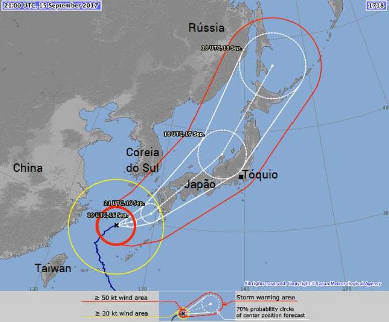 O mapa elaborado pela JMA mostra a trajetória prevista do tufão até a tarde da segunda-feira, 18 de setembro de 2017.