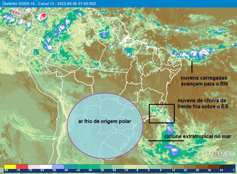 Ciclone extratropical começa a se afastar do Sul do Brasil. Ar frio de origem polar influencia vários estados nesta quinta-feira. Veja na imagem de satélite.