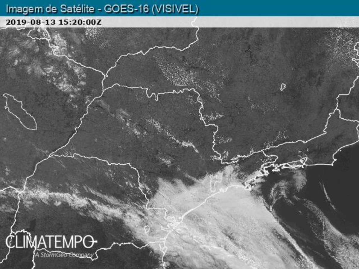 A imagem captada pelo satélite meteorológico GOES 16 mostra as nuvens baixas espalhadas por quase toda a faixa leste do estado de São Paulo. A imagem é de 12h20 (Brasília, ou 15:20 Z , no horário universal) e mostra que a maior parte do Vale do Paraíba ainda estava com sol, mas a nebulosidade já era grande pelo litoral norte de São Paulo .