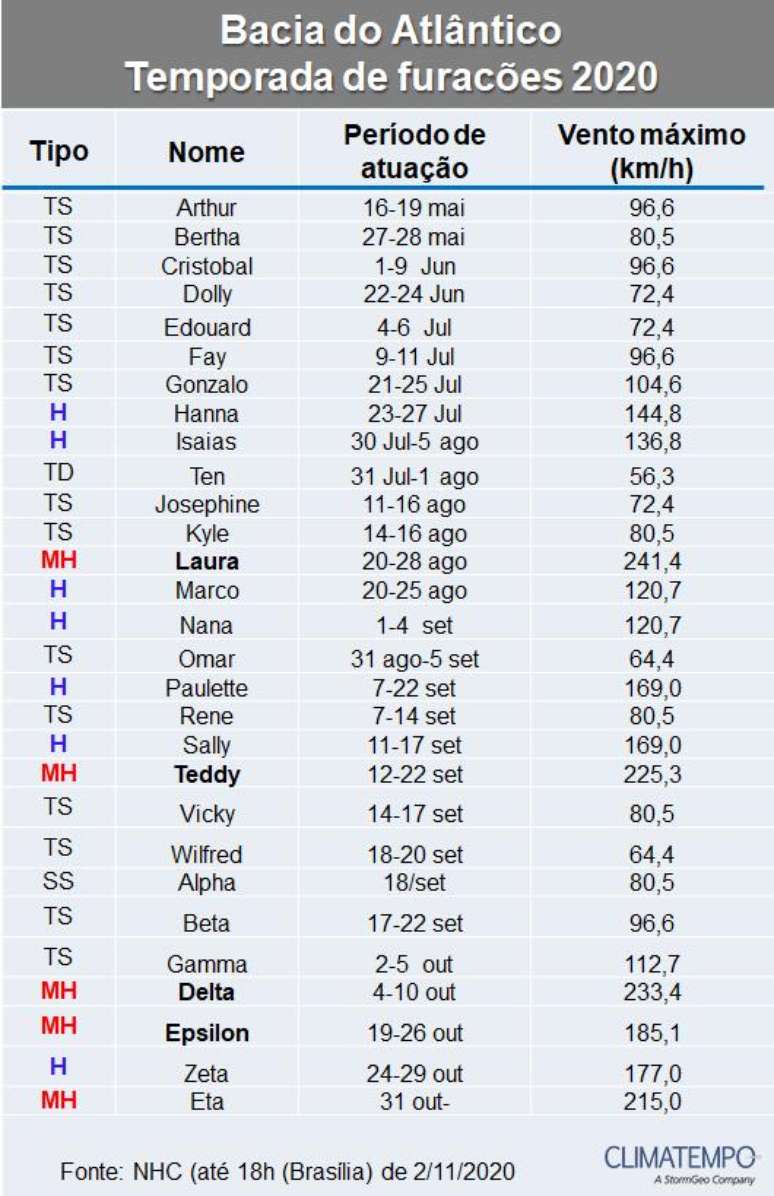 O furacão Eta é a 29ª tempestade da temporada de furacões do Atlântico Norte de 2020, e a 28ª nomeada. Mas, a temporada oficial só termina em 30 e novembro e com o Atlântico muito quente como está, outras certamente vão surgir.