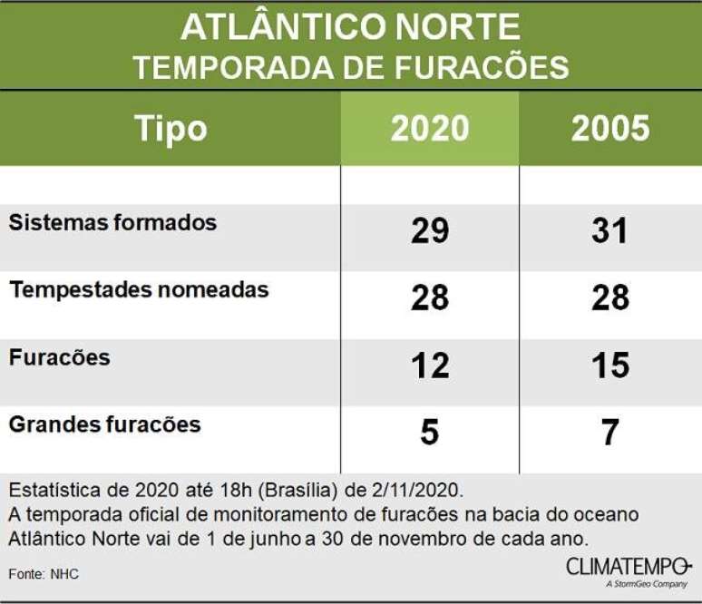 Comparação entre as temporadas de furacões no Atlântico Norte: 2020 x 2005