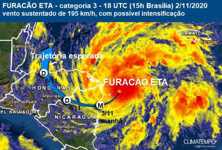 A letra M (de major), indica a posição do furacão Eta tocando o solo na Nicarágua como um grande (major) furacão. Ao avançar sobre o continente, o furacão vai perdendo força e se transforma numa depressão tropical nesta terça-feira, 3 de novembro, avançando sobre Honduras ainda neste estágio.