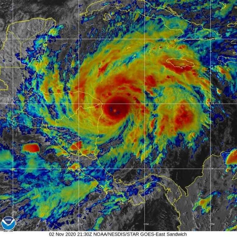 A tempestade tropical Eta se transformou em mais um furacão no mar do Caribe ao amanhecer desta segunda-feira, 2 de novembro. Mas com uma impressionante velocidade de intensificação, tornou-se um grande furacão no meio da tarde, com categoria 3 e no fim da tarde era um furacão ainda mais forte, com categoria 4..
