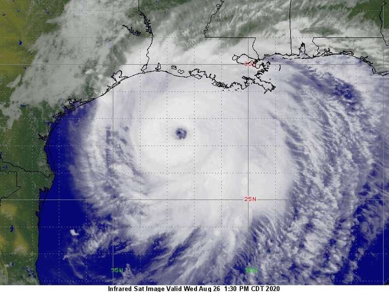 Laura se movimenta com velocidade de 24 km/h para noroeste e a previsão do NHC é de que alcance a costa norte do Texas e a costa sudoeste do estado de Louisiana no começo da noite desta quarta-feira, 26 de agosto de 2020.