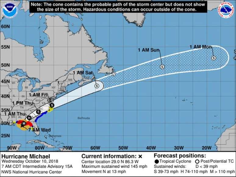 No boletim informativo do NHC de 12 UTC de 10/10/18 (09h00, em Brasília), Michael estava com ventos máximos sustentados de 230 km/h, com rajadas mais intensas, se movendo para norte com cerca de 20 km/h. O centro do furacão estava a aproximadamente 145 km ao sudoeste de Panama City e também a 145 km a oeste/sudoeste de Apalachiola, Flórida. Michael já é um furacão de categoria 4 e pode se fortalecer um pouco mais antes de tocar o continente.