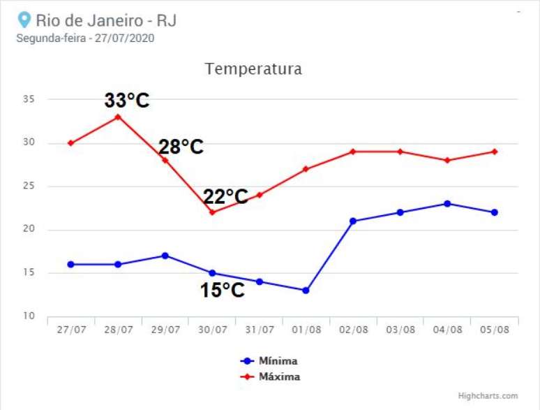 temperatura no Rio de Janeiro no fim de julho de 2020