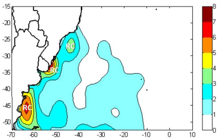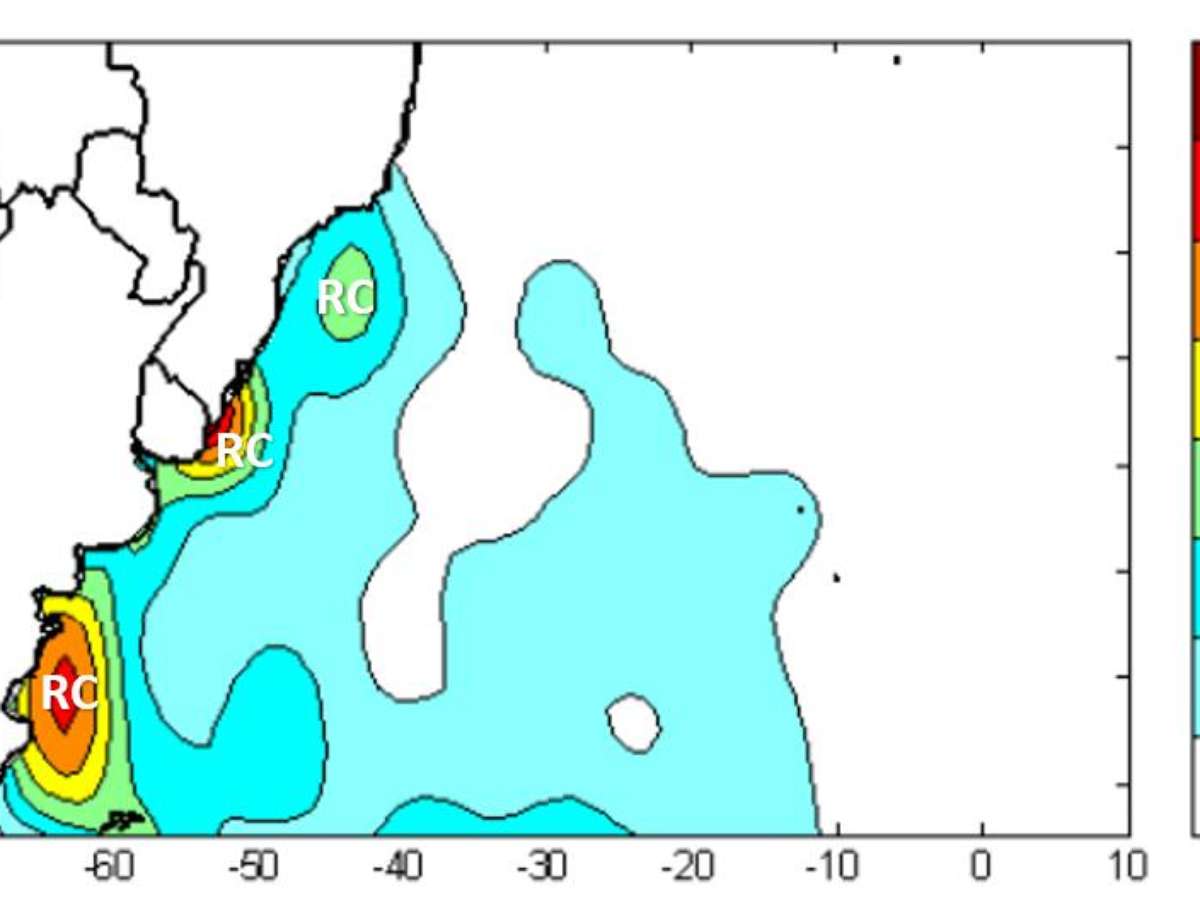 De forma análoga, variações na TSM do Atlântico Sul são capazes de alterar as condições de tempo nas porções sul e sudeste da América do Sul (REBOITA et al., 2009), principalmente devido à existência de três regiões ciclogenéticas (área favorável a formação de ciclones, indicada por RC na Figura 1), localizadas no sul da Argentina, na costa do Uruguai e na costa Sul/Sudeste do Brasil, respectivamente.