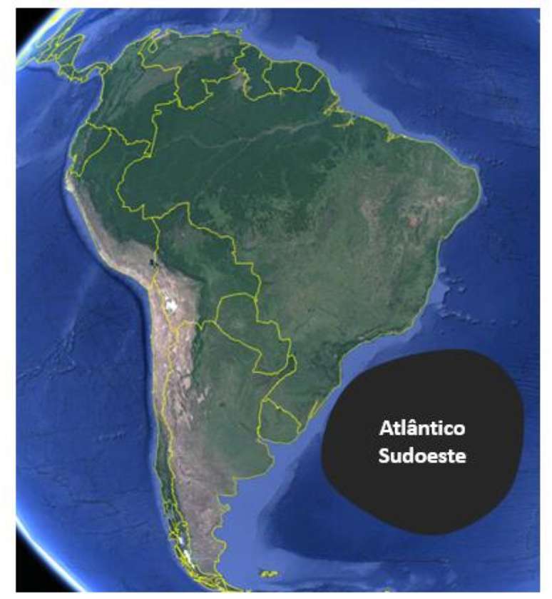 Imagem de satélite da AS com área delimitada em cinza destacando o Atlântico Sudoeste.