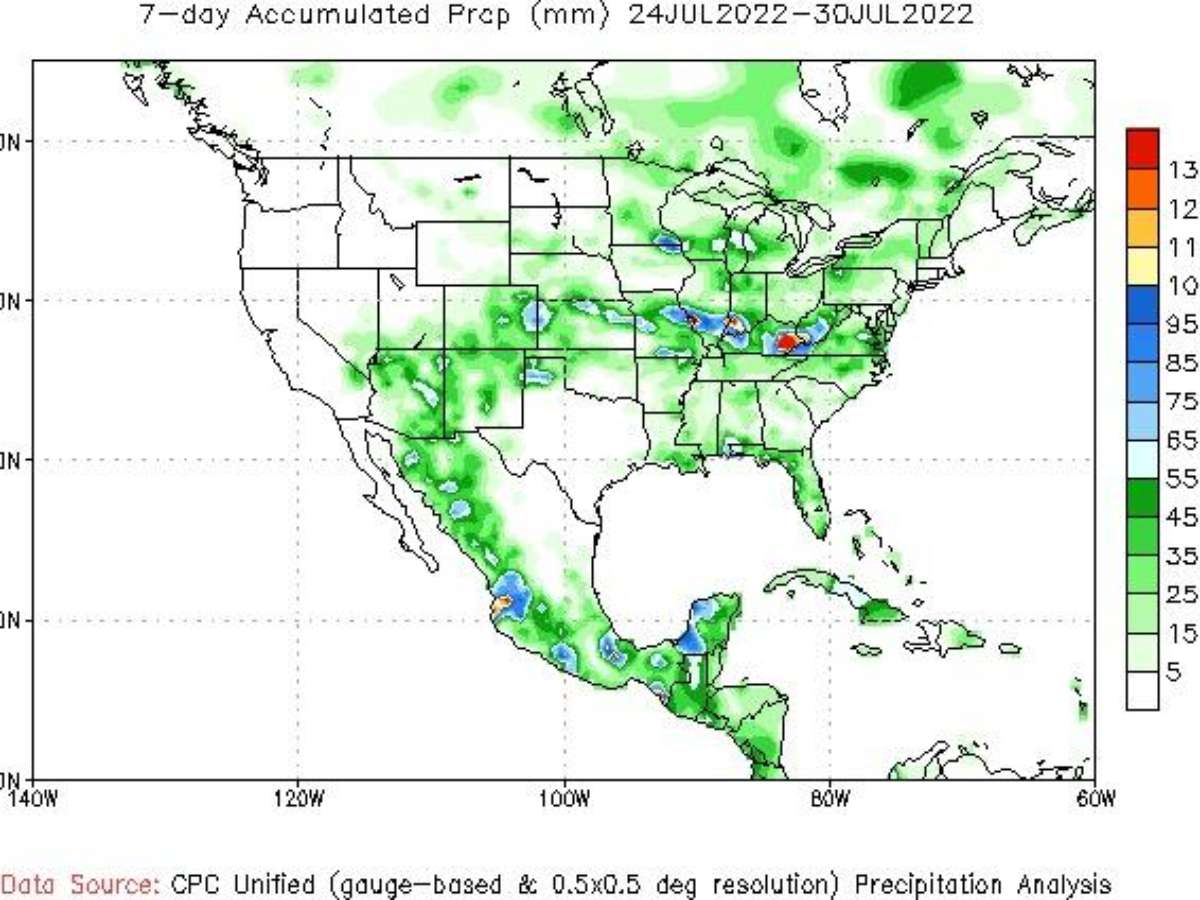 Em Missouri e Illinois, entre terça(26) e quarta-feira(27), choveu em torno de 300mm, com valores entre 105 a 250 em um único dia, quinta-feira (28). No leste do Kentucky, foram de 200 a 270 mm, sendo mais intensa na quinta-feira (28). Na sexta-feira (29/07), também houve chuva intensa no norte do Delta do Mississippi.