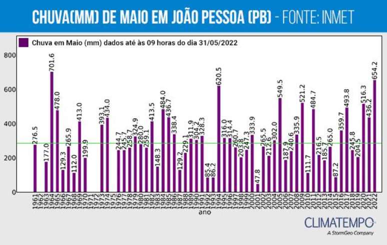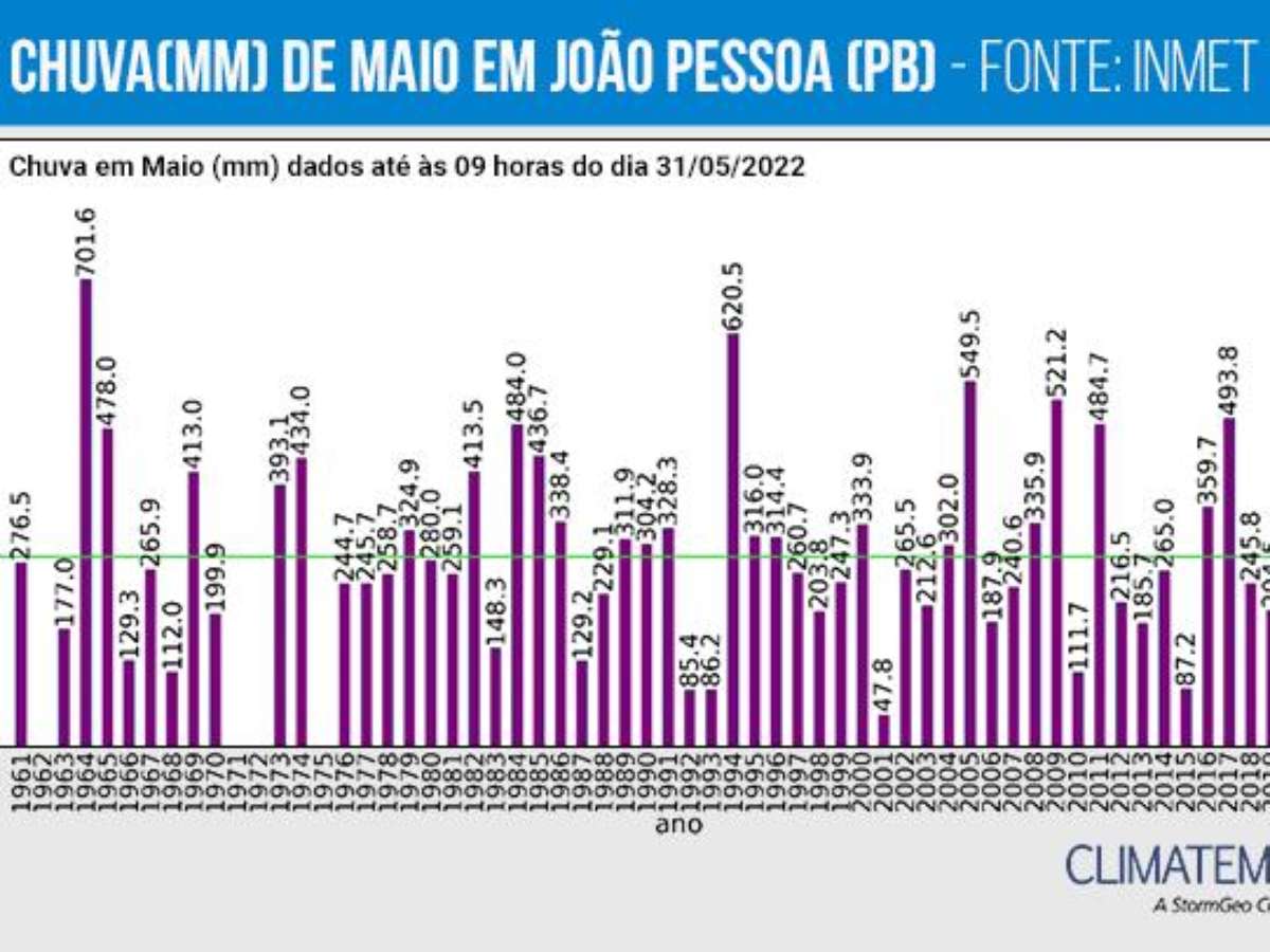 Dentre os dados disponíveis, desde 1961 até 2022, maio do ano de 1964 foi o mais chuvoso, com 701,6mm. A linha verde no gráfico acima, indica a climatologia de maio em João Pessoa (287 mm).