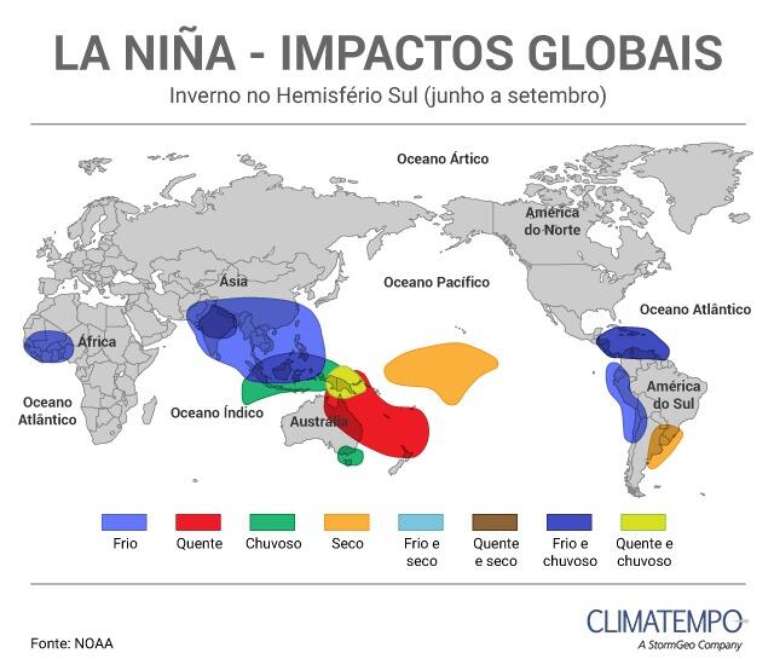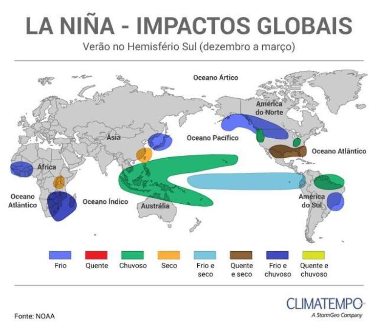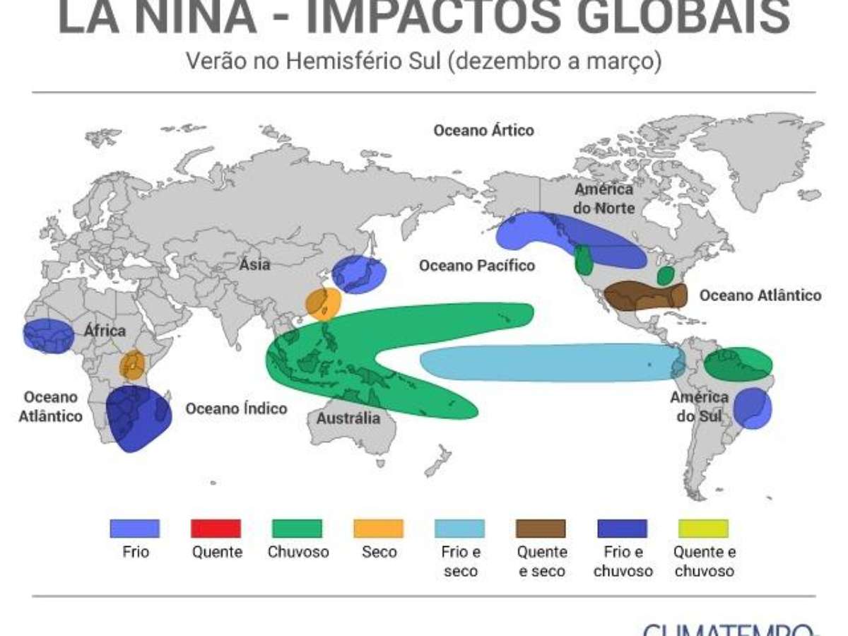 A Climatempo indica que a La Niña se estabeleça entre o fim da primavera e o verão, mas que seus impactos no clima global serão com fraca intensidade.