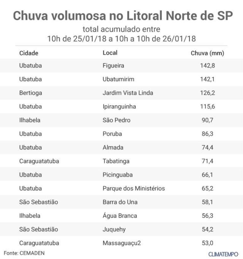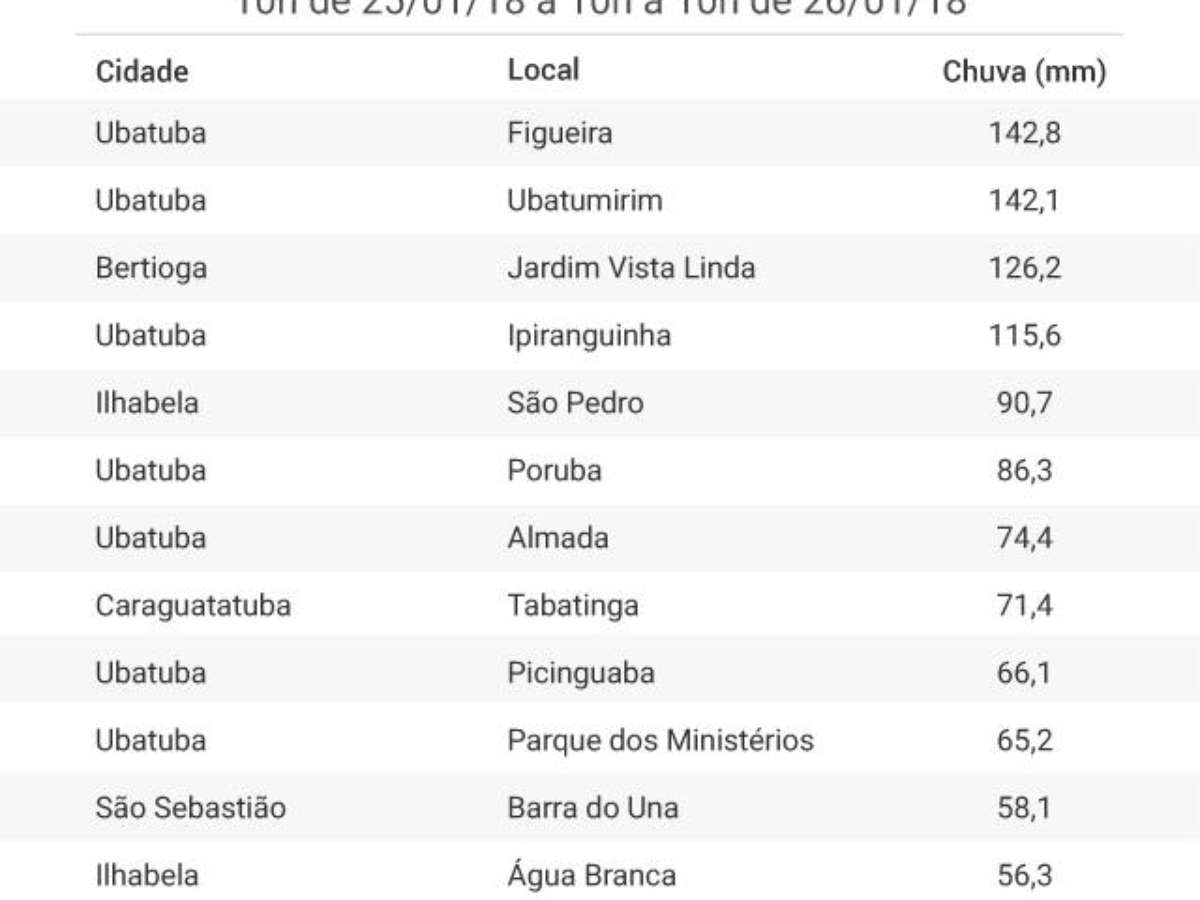 Várias áreas entre Bertioga e Ubatuba já acumulada mais de 100 mm em 24 horas, mas em alguns locais foi em menos tempo. Em Bertioga, o Instituto Nacional de Meteorologia registrou 110,2 mm em 4 horas de chuva, entre 6 horas e 10 horas da manhã.