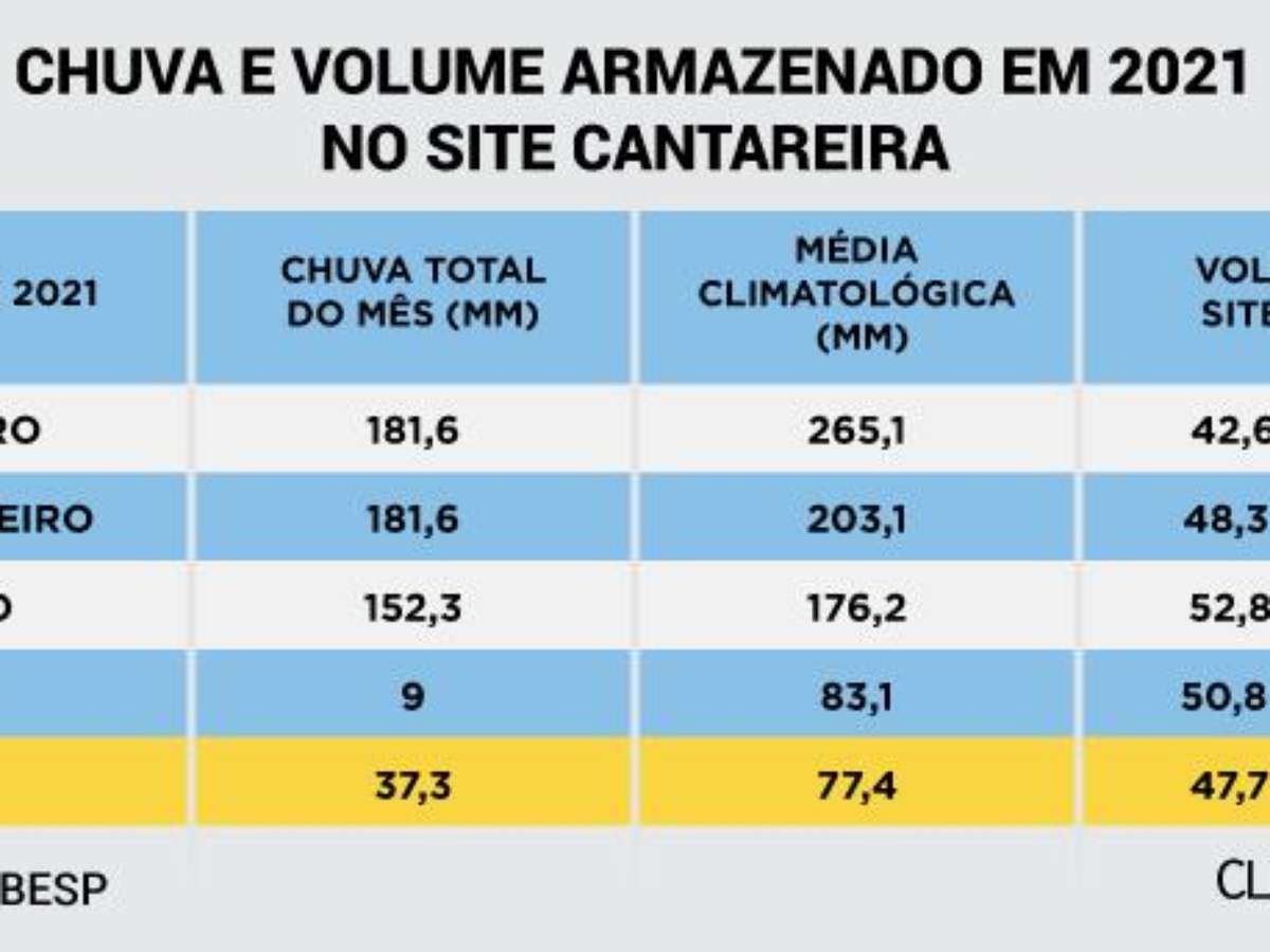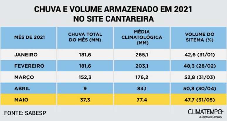 São cinco meses seguidos que o Cantareira apresenta volumes de chuva abaixo das suas médias climatológicas. A última chuva acima da sua média, em um mês, foi em dezembro de 2020 quando foram acumulados 225,3 milímetros.