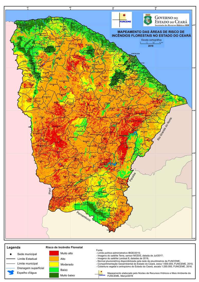 Um dos estudos mais recentes da Fundação Cearense de Meteorologia e Recursos Hídricos (Funceme) indica que o Ceará possui áreas de 20 municípios com alto risco de incêndios florestais. O projeto foi financiado pelo Fundo de Defesa dos Direitos Difusos do Estado do Ceará (FDID), tendo sido iniciado em 2017 e concluído neste ano.