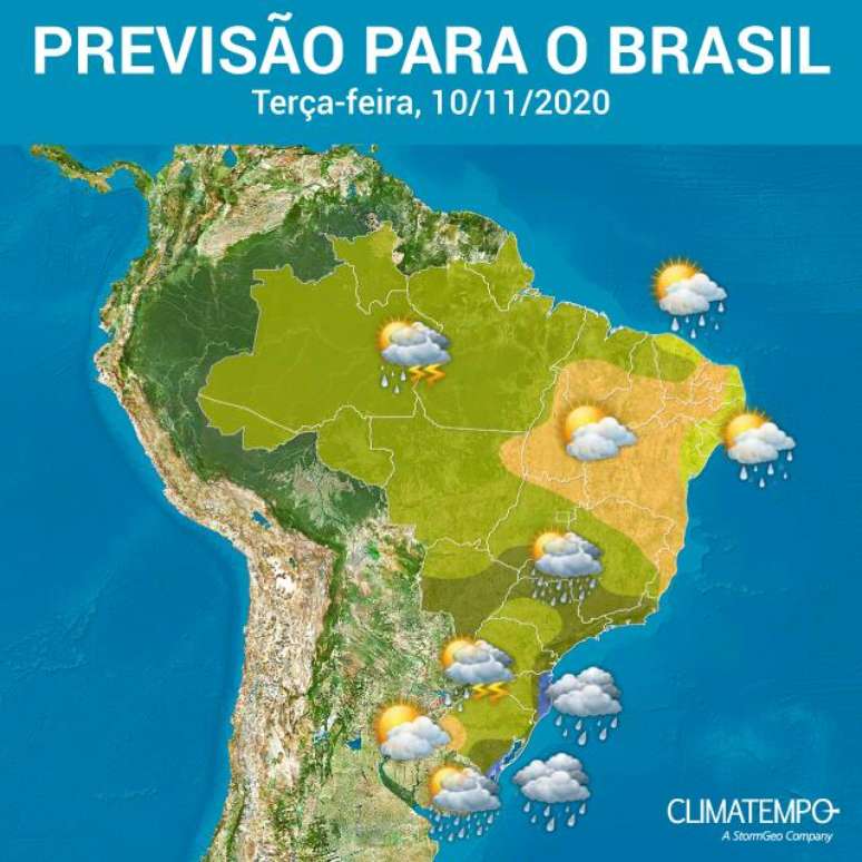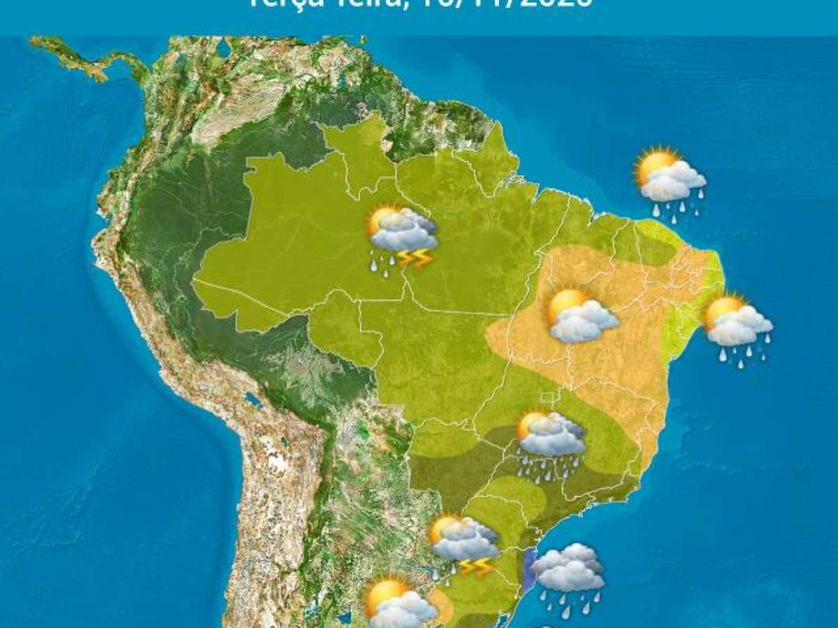 Pancadas de chuva já ocorreram na madrugada desta terça-feira na maioria das áreas do Norte, do Centro-Oeste, do Sudeste e do Sul do Brasil.