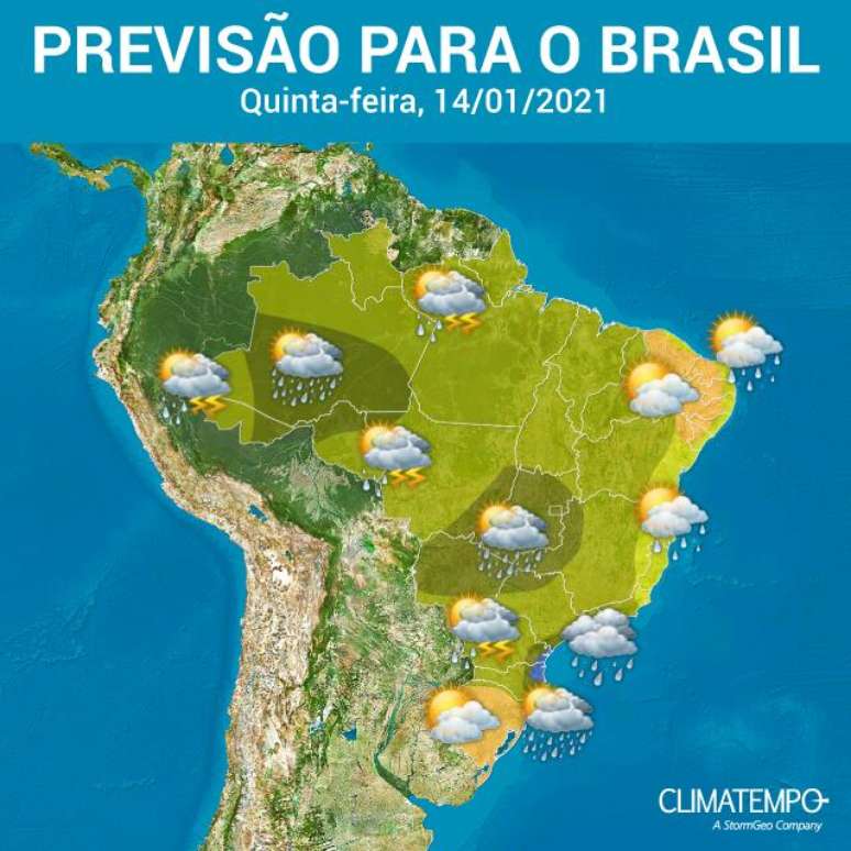 Durante esta quinta-feira, 14 de janeiro, a maior concentração de nuvens carregadas deve acontecer sobre os estados do Centro-Oeste do Brasil, São Paulo, centro-oeste de Minas Gerais, Amazonas e Rondônia.