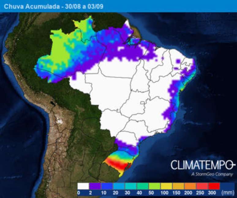No período entre os dias 30 de agosto e 3 de setembro, o acumulado de chuva pode passar de 250mm, como indicado abaixo. Veja: