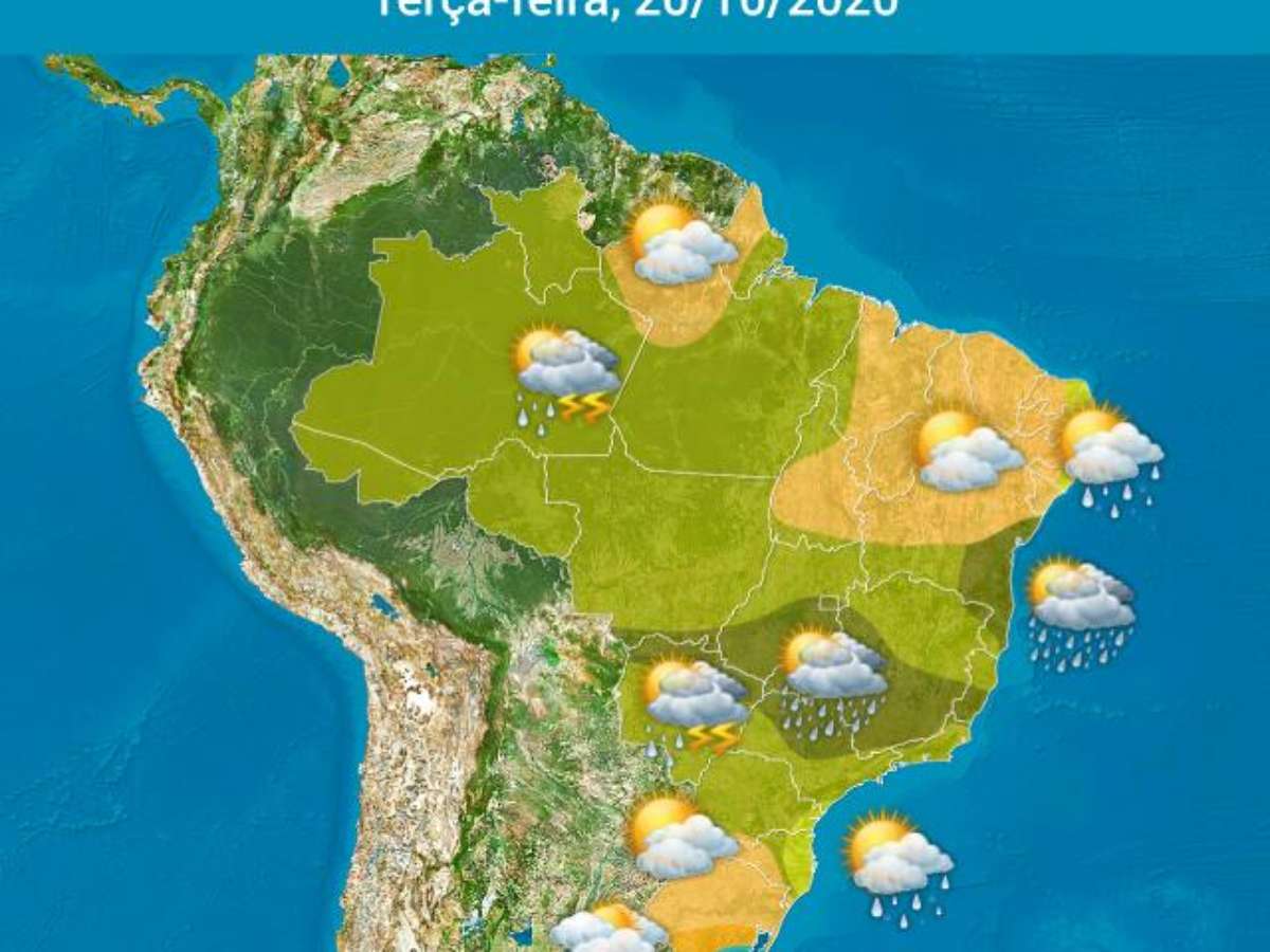 A maioria das áreas do Brasil tem tempo instável nesta terça-feira, 20 de outubro, com grande condições para chuva. É um dia com risco de chuva forte em muitas regiões do país.