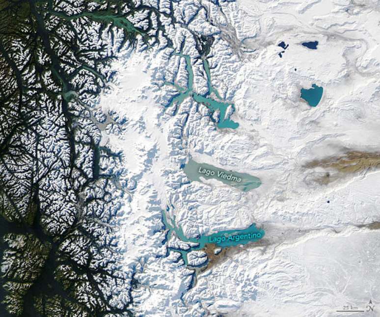 Na imagem abaixo, capturada no dia 26 de junho pelo Espectrorradiômetro de Imagem de Resolução Moderada (MODIS), do satélite Aqua da NASA, o céu estava limpo em quase toda a Patagônia, que abrange mais de 1 milhão de quilômetros quadrados do extremo sul do continente. Além disso, é possível observar a neve desde as encostas ocidentais da Cordilheira dos Andes, no Chile, até as planícies costeiras da Argentina.