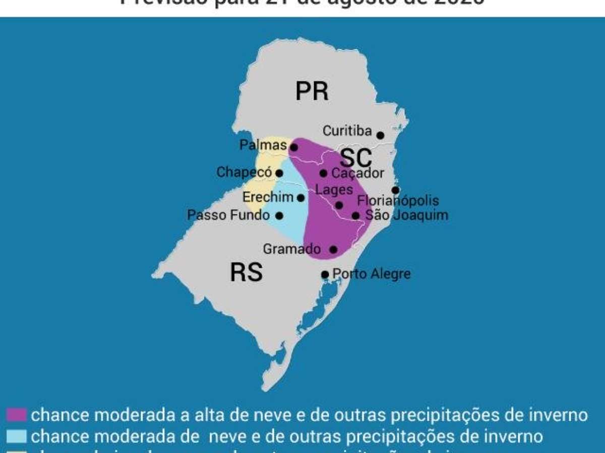 Para esta sexta-feira tem previsão de neve e outros tipos de precipitação de inverno na serra do Rio Grande do Sul, na serra e nos planaltos sul e norte de Santa Catarina e no sul do Paraná.