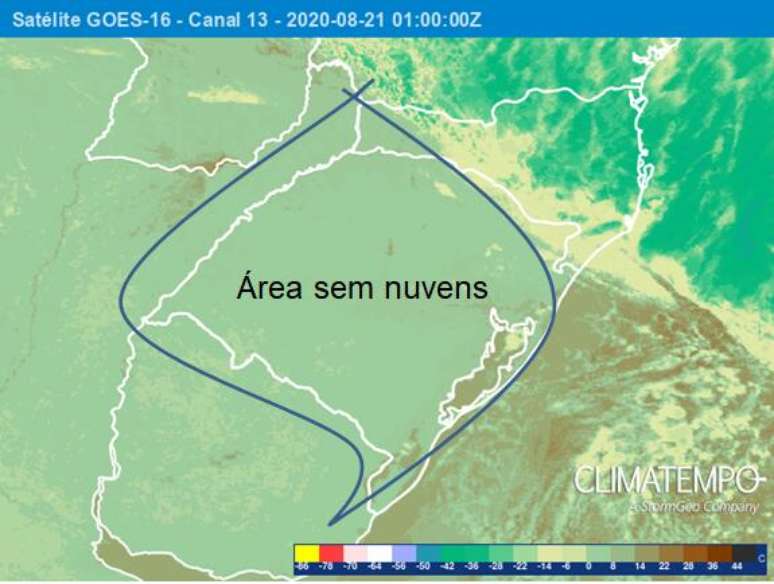 Quase todo o Rio Grande do Sul e o oeste de Santa Catarina já estavam praticamente sem nuvens. São nestas áreas que a geada se forma já na madrugada e ao amanhecer desta sexta-feira, 21. A geada também deve ocorrer no sudoeste do Paraná, região de Foz do Iguaçu.