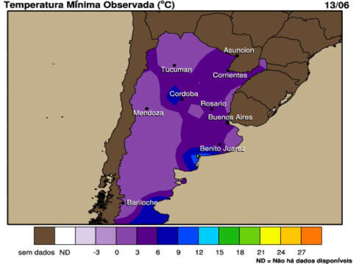 De acordo com os dados de aeroportos, La Paz, Bolívia registrou -8°C na manhã de segunda-feira (13). Em San Carlos Baril, Argentina, fez -3°C; em Durazno, Uruguai, -1°C. Já Buenos Aires começou a segunda com 5°C, e Montevidéu registrou temperatura de 1°C.