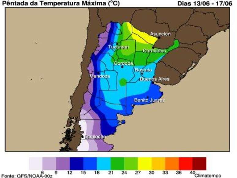 A umidade do ar fica abaixo do ideal (abaixo dos 30%) durante esta semana no norte e meio oeste da Argentina. E a chuva pode vir apenas no extremo sul do país, como na província de Santa Cruz e Tierra del Fuego, entre quinta (16) e sexta-feira (17), em forma de chuva congelada e neve.