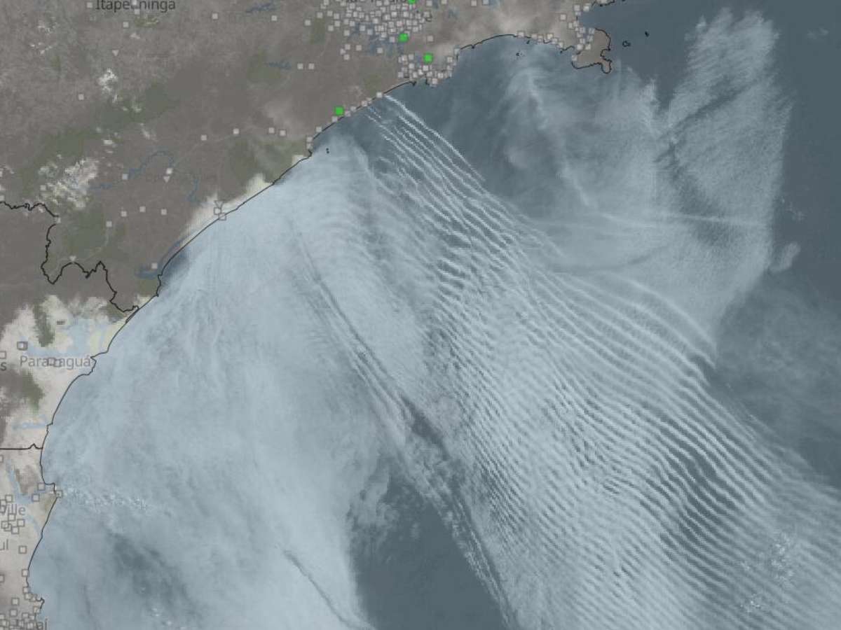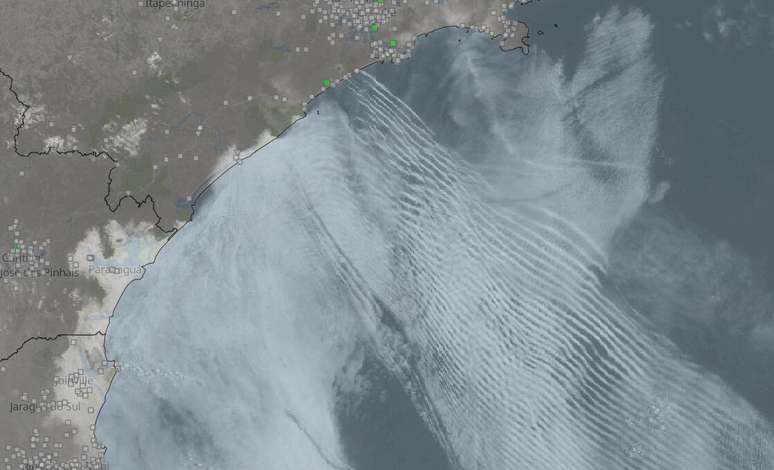 Imagens do satélite GOES-16, mostram neste final de manhã, uma extensa faixa de um tipo de nuvem rara é observado no sul do litoral paulista. No decorrer do dia, essa banda de nuvens avança também para o litoral norte de São Paulo.