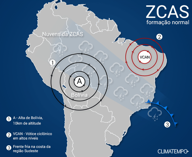 A Zona de Convergência do Atlântico Sul é uma grande e prolongada zona de convergência de umidade sobre o Brasil resultado da interação da circulação de ventos de vários sistemas meteorológicos que atuam ao mesmo tempo: frente fria na costa do Sudeste, Vórtice Ciclônico de Altos Níveis (VCAN) no Nordeste, sistema de baixa pressão atmosférica ( circulação ciclônica, horária) que se forma em torno de 10 km de altitude, a Alta da Bolívia, grande sistema de alta pressão atmosférica (circulação anticiclônica, anti-horária) que se estabelece em torno de 10 mil metros de altitude, e também a presença de um cavado atmosférico (ondulação na circulação de ventos no sentido horário) em médios níveis da atmosfera, em torno de 5 mil metros de altitude.