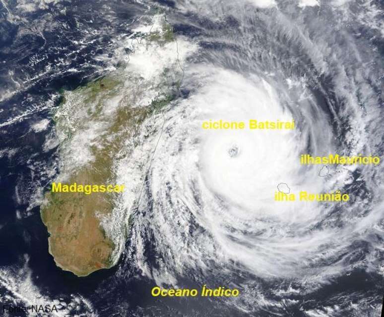 Ciclone tropical Batsirai perto de Madagascar em 4/2/2022 (Satélite NASA)