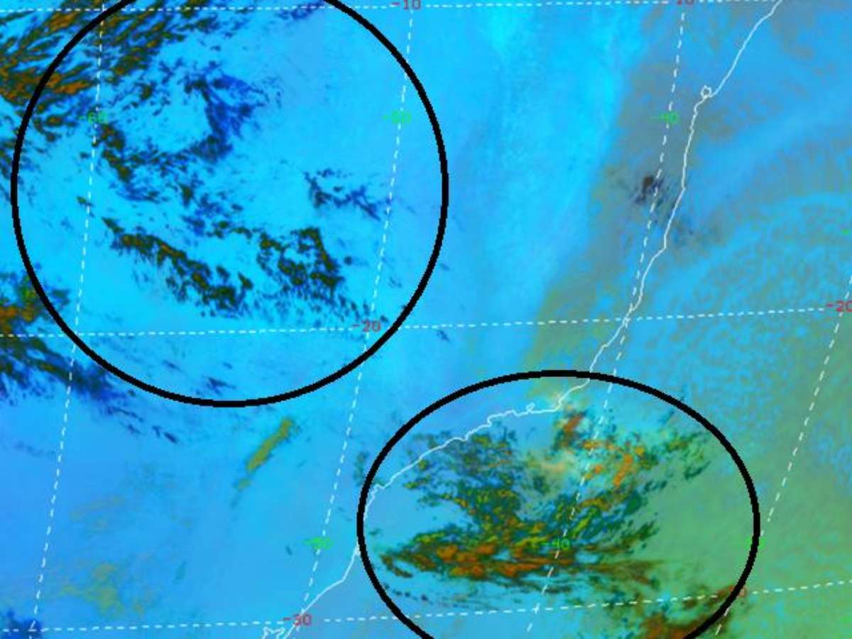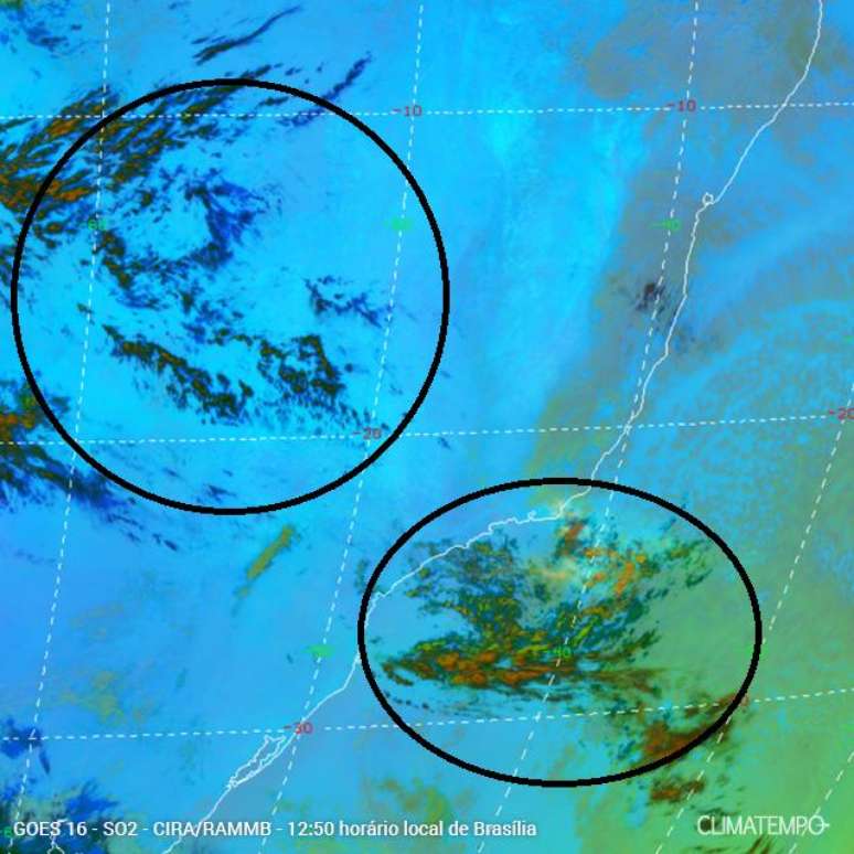 A imagem abaixo mostra o produto de dióxido de enxofre (SO2) e cinzas vulcânicas do satélite GOES-16 das 12h50min (horário local de Brasília) deste sábado (20). As camadas mais escuras mostram onde há maior concentração de cinzas (área circulada) e de SO2. AS áreas de Mato Grosso, Mato Grosso do Sul, Goiás e em áreas do estado de São Paulo, Paraná e Santa Catarina devem ser as mais afetadas nestes próximos dias pelos efeitos da poluição vulcânica.