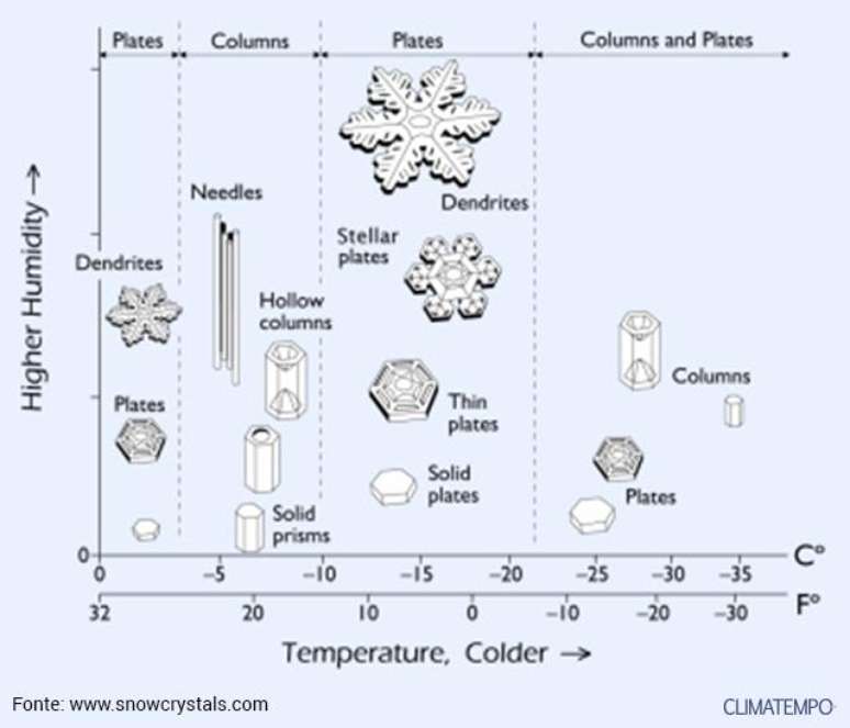 Quantos cristais de gelo diferentes existem na natureza? Impossível responder, pois não existe um cristal igual ao outro. Existem dezenas de padrões catalogados, mas dentro destes padrões há uma infinidade de formações distintas. A formação dos cristais de gelo é um dos assuntos fascinantes da meteorologia. Cada padrão se forma a uma temperatura diferente. Vários cristais de gelo se unem para formar um floco de neve.