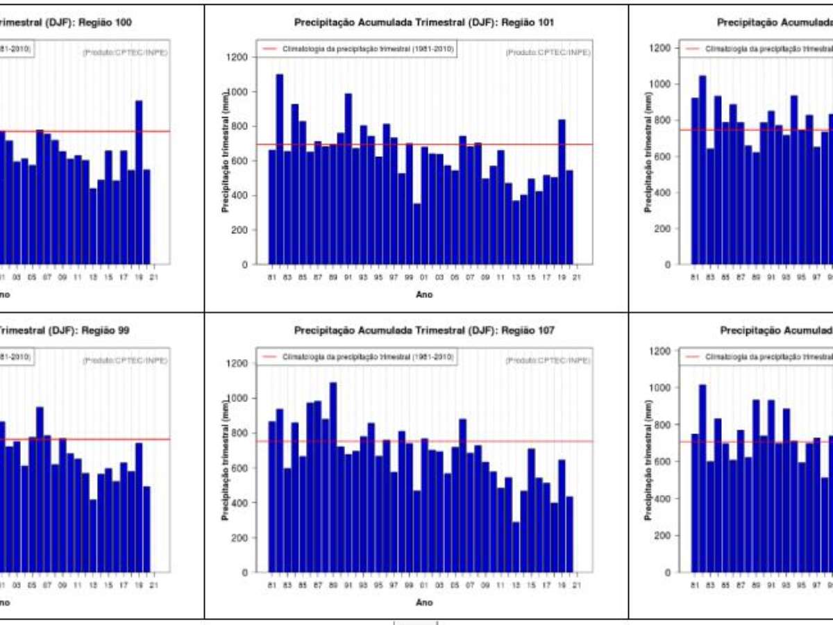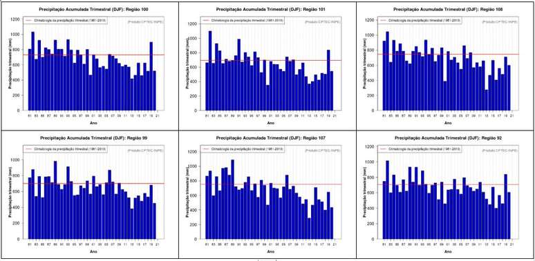 Imagem - Evolução da precipitação entre 1981 e 2021 no trimestre dezembro-janeiro-fevereiro nos estados de São Paulo, Minas Gerais e Goiás. Região 92: leste de Goiás e Distrito Federal; Região 99: tríplice divisa entre Minas Gerais, Goiás e Mato Grosso do Sul; Região 100: Triângulo Mineiro; Região 101: Cerrado de Minas Gerais; Região 107: norte de São Paulo; Região 108: sul de Minas Gerais - Fonte: Cptec/Inpe