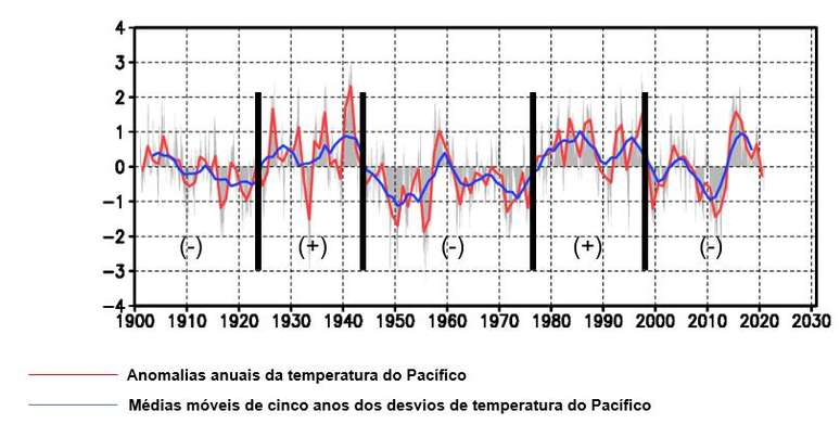 Imagem - Variação Interdecadal do Pacífico. Desvios (anomalias) anuais e quinquenais da temperatura do Pacífico com destaque para as fases quentes e frias - Fonte: JMA-Japão.
