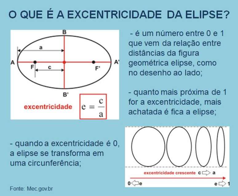Perceba que a órbita da Lua não é uma circunferência perfeita. Ela possui um leve achatamento. Essa figura achata é chamada de elipse. Toda a elipse possui uma excentricidade diferente de 0, pois quando a elipse possui uma excentricidade igual a 0, na verdade ela é definida como circunferência.
