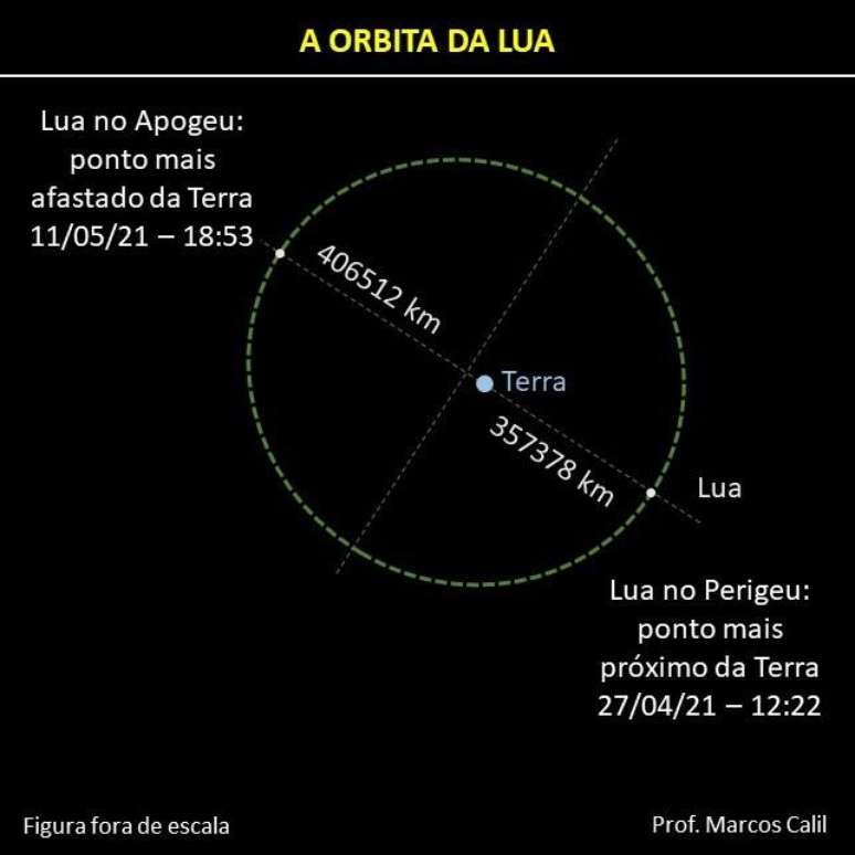 A figura 1 mostra a excentricidade da órbita da Lua, a menor e a maior distância Terra-Lua para os dias 27 de abril e 11 de maio (respectivamente), além da Lua e da Terra.