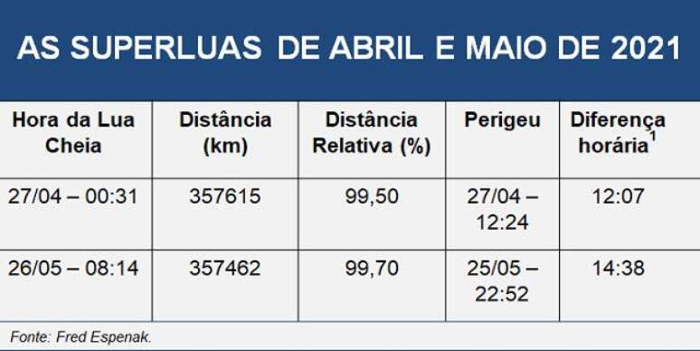 Tabela 1. Dados observacionais de Fred Espenak para as.Superluas de abril e maio de 2021