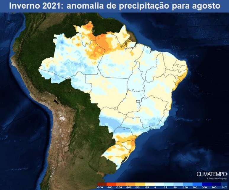 A maior parte dos dias será de tempo aberto, com sol forte e temperaturas altas, como é comum na região. É o período seco, então a chuva já não é esperada. Apenas no MS ainda ocorrem algumas pancadas pela influência de frentes frias mais continentais. Algumas massas de ar frio conseguem chegar até as capitais de MS, MT e poucas conseguem chegar a Goiânia e Brasília, onde a temperatura fica bastante estável ao longo da estação. Há risco para ocorrência de eventos de geada no MS, mas no sul de GO é menos provável. O maior risco de geada é para agosto