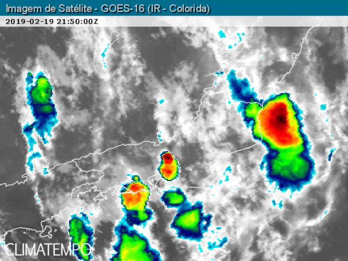 Esta área de chuva forte passa sobre o Grande Rio e depois deve avançar sobre a Baixada Litorânea que já teve chuva forte durante a tarde. Há risco de chuva moderada a forte e com raios em todo o Grande Rio