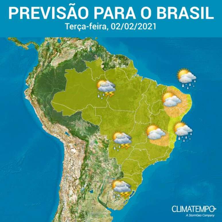 Há condições para pancadas de chuva com raios nesta terça-feira, 2 de fevereiro, em quase todo Brasil. De forma geral essas pancadas de chuva vão acontecer à tarde e à noite, podendo ser localmente fortes..