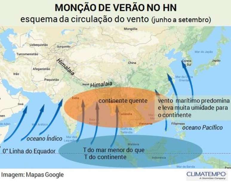 O ar úmido em contato com o continente muito aquecido gera grandes massas de nuvens carregadas, que persistem sobre o sul da Ásia por semanas seguidas e provocam muita chuva.