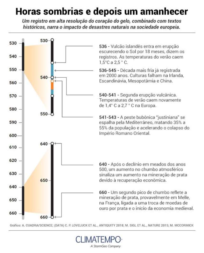 Os estudos dos anéis das árvores na década de 90 já sugeriam que os verões por volta do ano 540 eram excepcionalmente frios, mas os pesquisadores procuravam a causa. Três anos atrás, os núcleos de gelo polares da Groenlândia e da Antártica deram uma pista. Quando um vulcão entra em erupção, vomita enxofre, bismuto e outras substâncias na atmosfera, que formam um véu de aerossol que reflete a luz do sol de volta ao espaço, resfriando o planeta. Ao combinar o registro de gelo desses traços químicos com os registros climáticos em anéis de árvores, uma equipe liderada por Michael Sigl, agora da Universidade de Berna, descobriu que quase todo verão incomumente frio nos últimos 2500 anos era precedido por uma erupção vulcânica. Uma erupção maciça - talvez na América do Norte, sugeriu a equipe - se destacou no final de 535 ou no início de 536; seguida de outro em 540. A equipe de Sigl concluiu que esse "golpe duplo" explicava o escuro e o frio prolongados.