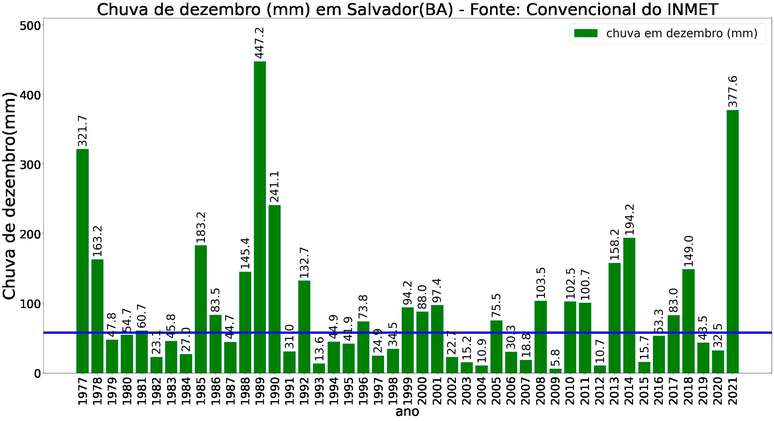 Acumulados de chuva nos mês de dezembro em Salvador (BA), desde 1977