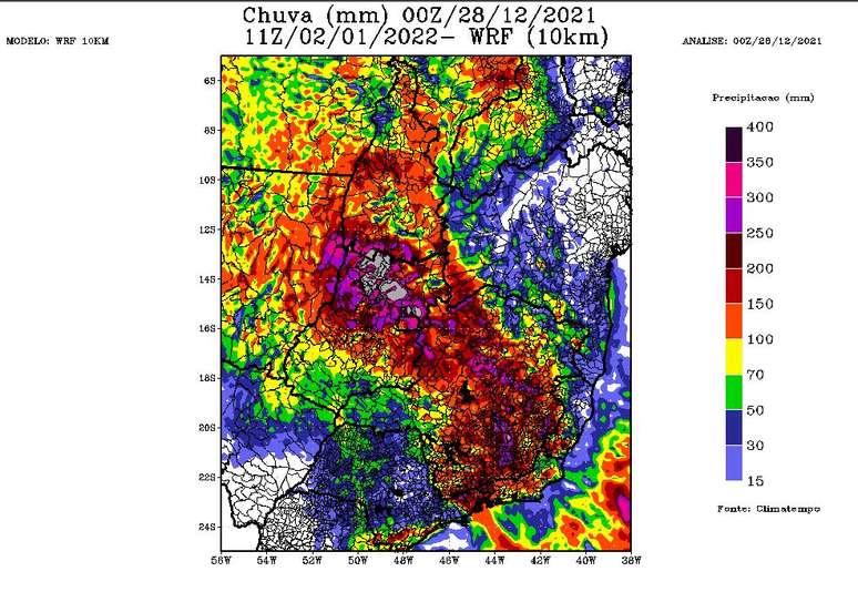 Previsão de acumulado de chuva entre os dias 28/01/2021 e manhã de 04/01/2022 pelo modelo Weather Research and Forecasting Model (WRF). Fonte: Climatempo