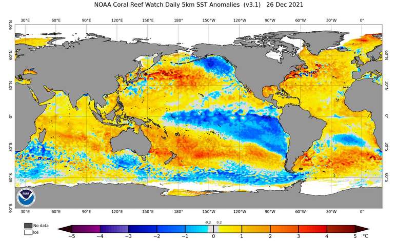 Anomalia da temperatura superfície do Oceano em dezembro de 2020