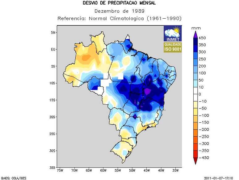 Anomalia de chuva em dezembro de 1989 no Brasil. Fonte:INMET