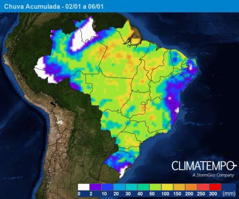 No norte de Goiás, em Minas Gerais e leste do Mato Grosso, os acumulados em média podem chegar aos 300mm em alguns municípios, alguns até ultrapassando esse valor, conforme indica na figura em rosa e cinza, pelo mesmo modelo.