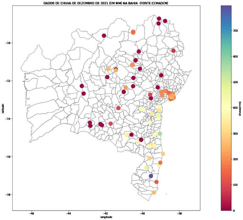 Acumulados de chuva em dezembro de 2021 na Bahia. Fonte: Cemaden.